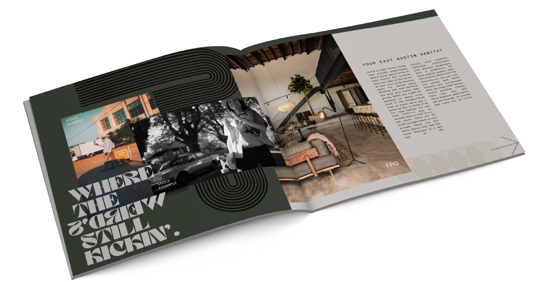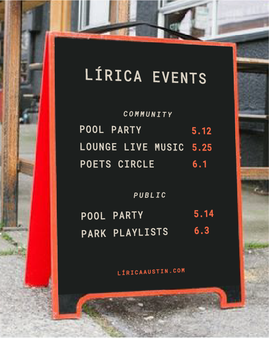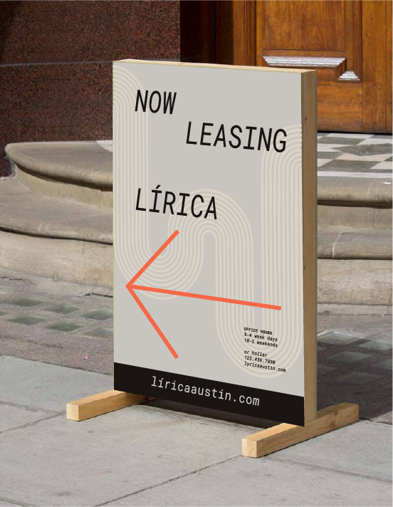 In multifamily branding, coherence matters. When the brand stops at the logo, the experience falls apart. At Lírica, graphics become murals, patterns live in the space, and the identity moves easily between interiors, signage, and digital touchpoints. The result is a living system — one that feels specific to East Austin, and flexible enough to evolve alongside it.
