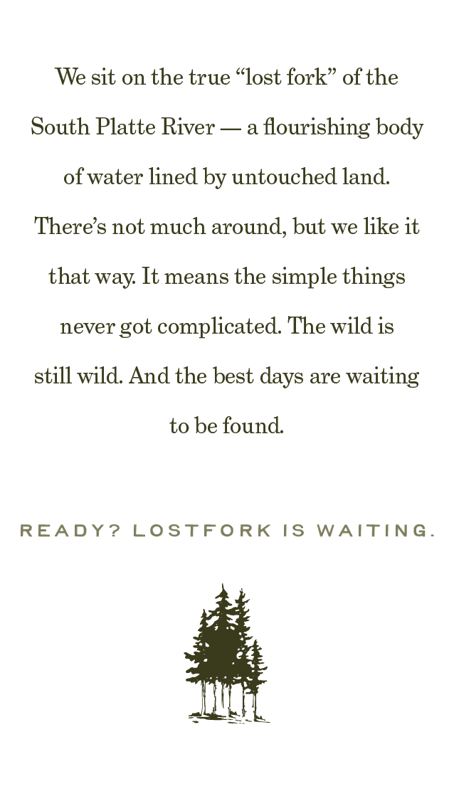 It sits on the true “lost fork” of the South Platte River — a flourishing body of water lined by untouched land. There’s not much around, just the way it should be. It means the simple things never got complicated. The wild is still wild. And the best days are waiting to be found. Ready? Lostfork is waiting.
